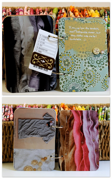 I was quite excited to find vintage-y flowers in the package for 59 cents, along with labels and the sheets of metallic embellishments at the same price. The little bits of hardware, tiny circle tags, and word stickers were only 39 cents a package. I think that the binder rings are one of my favorite finds from this shopping trip- they have a nice aged look to them, unlike the shiny new ones I buy at the office supply store.
